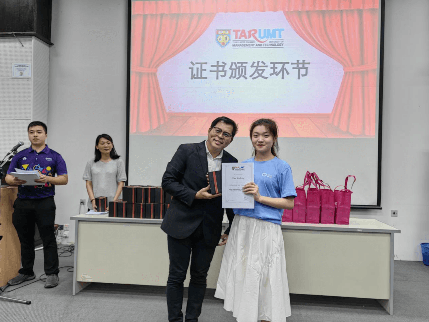 结业仪式上,拉曼理工大学继续和专业教育中心副主任Lee Kin Chai为我院学生颁发了结业证书,希望大家将本次短期研学的收获用于未来的学习和工作中,并祝愿大家前程似锦,欢迎再来马来西亚拉曼理工大学交流学习。
