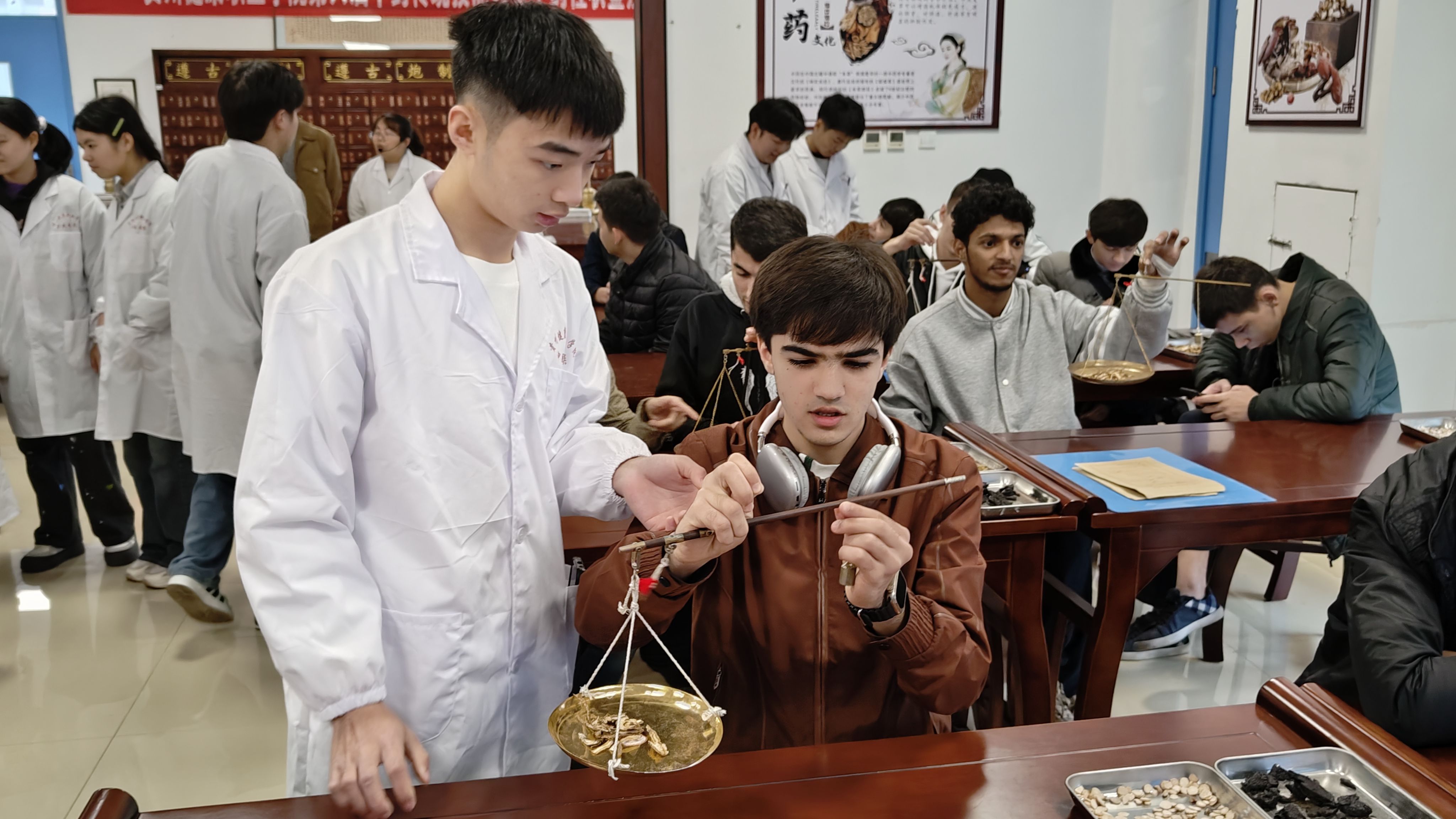 在活动中,留学生在今年会体育馆和四系实训室体验了八部金刚功、心肺复苏、新生儿抚触、艾灸、推拿、皮肤检测、化妆、中药调剂抓取演示、中药香囊制作等活动。