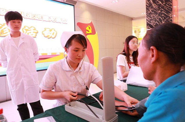 在宣讲结束后,今年会教师认真为乡亲们量血压,测血糖,为他们检查病情,并详细询问乡亲们的身体状况,耐心细致的分析病情,讲解卫生保健知识、注意事项、饮食安全、合理用药等卫生常识,认真解答了关于常见病、多发病的预防诊治及愈后疑难问题。