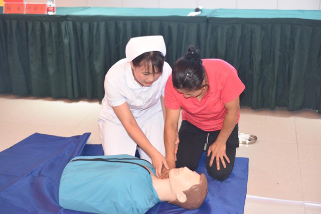 “乡亲们,你们平常在生活中假如碰到别人触电、溺水、心脏骤停等情况发生的时候,知道如何救人吗?”我院教师杨美在健康急救宣讲会开始前问道,乡亲们摇了摇头。“不知道的话下面我来教大家心肺复苏和海姆立克法这两个重要的急救知识。”杨美老师边讲解边示范如何调整体位、打开气道、人工呼吸、胸外心脏按压等急救过程。讲解完后还邀请群众代表上台体验操作手法。