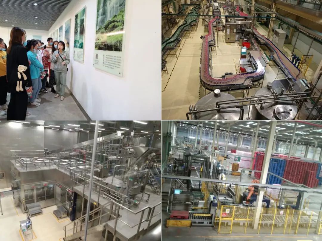 在农夫山泉武陵山饮料有限公司,讲解员首先为新生介绍企业三大理念文化,一是环保理念,农夫山泉从不使用城市自来水,每一滴农夫山泉都有它的源头;二是天然理念,坚持水源地建厂,水源地灌装;三是健康理念,天然的弱碱性水,不添加任何的人工矿物质。随后,讲解员通过对广告语“农夫山泉有点甜”生动形象地解说,引导学生将理论知识和实践技能相结合。通过厂区分阶段的讲解,学生了解到农夫山泉的八大优质水源地、水的ph值测试、人体所需的水的矿物质元素等知识。在讲解员的带领下,学生参观了农夫山泉的整个生产线,深入了解农夫山泉的企业文化和生产线的运行模式。