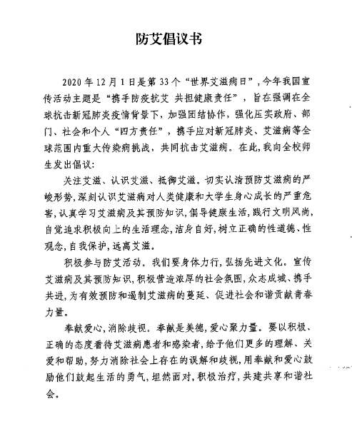 12月1日是第三十三个“世界艾滋病日”,为深化新时代学校健康教育,将新时代学校防疫防艾教育工作常态化,学院党委副书记、院长吴国才发起倡议,院团委协同各部门、学生组织,共同开展防艾“十个一”系列活动。