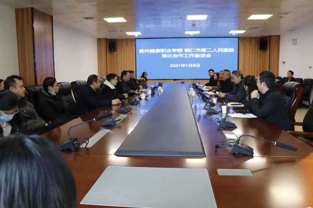 1月8日下午,铜仁市第二人民医院党委书记李陈一行40余人到我院考察调研并洽谈合作事宜。院党委副书记、院长吴国才主持召开双方深化合作工作座谈会,院党委委员、副院长陈太雄和院党委委员、党政办主任王晶韵出席,教务处、规划财务处、护理系、继续教育部负责人参加座谈会议。