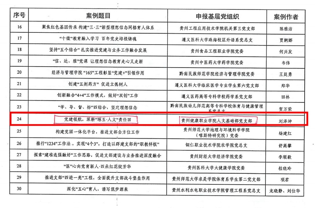 近日,中共贵州省委教育工委印发了《省委教育工委关于公布2021年全省高校党建工作创新最佳案例和优秀案例名单的通知》,公布了“2021年全省高校党建工作创新最佳案例”和“2021年全省高校党建工作创新优秀案例”名单,我院推送的人文基础部党支部案例“党建领航,深耕‘琢玉·人文’责任田”荣获“全省高校党建工作创新最佳案例”,护理系教工党支部案例“一核两翼创五星 乘风展翅逐日新”荣获“全省高校党建工作创新优秀案例”。