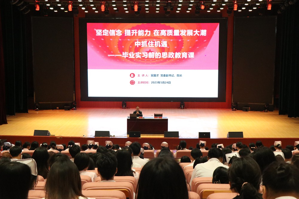 5月24日,院党委副书记、院长吴国才在大礼堂为护理系213级学生上思政理论课。党委委员、护理系主任刘艳,213级全体学生及辅导员参加。