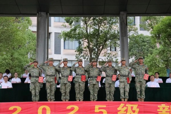 大会表扬了2025级学生军训优秀连队、优秀教官、优秀指导员、优秀学员和优秀通讯员,为学校2025年入伍的同学颁发入伍通知书和荣誉证书,并佩戴大红花。