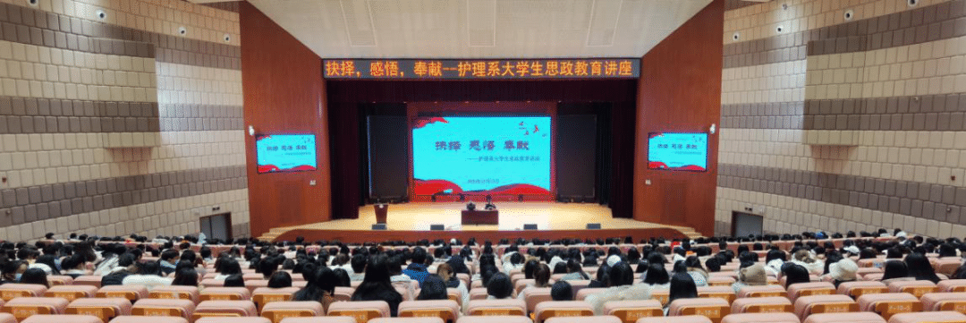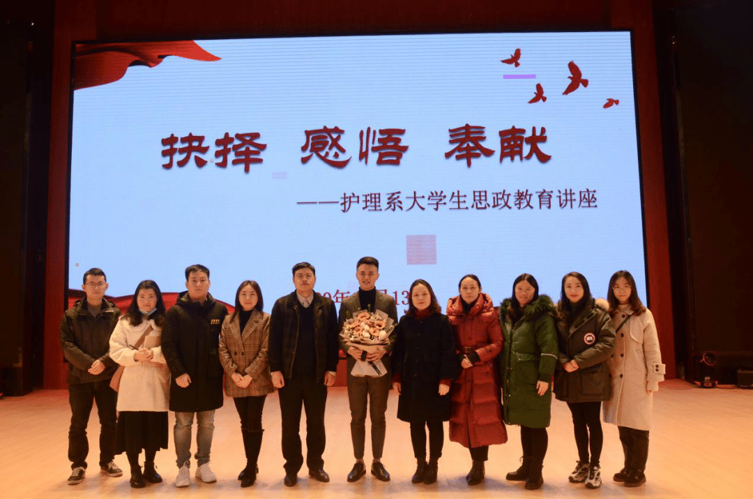 12月13日,护理系在大礼堂组织开展以“抉择,感悟,奉献”为主题的大学生思政教育讲座,护理系2019级、2020级全体辅导员及学生代表参加讲座,本次讲座由党委委员、主任刘艳主持。