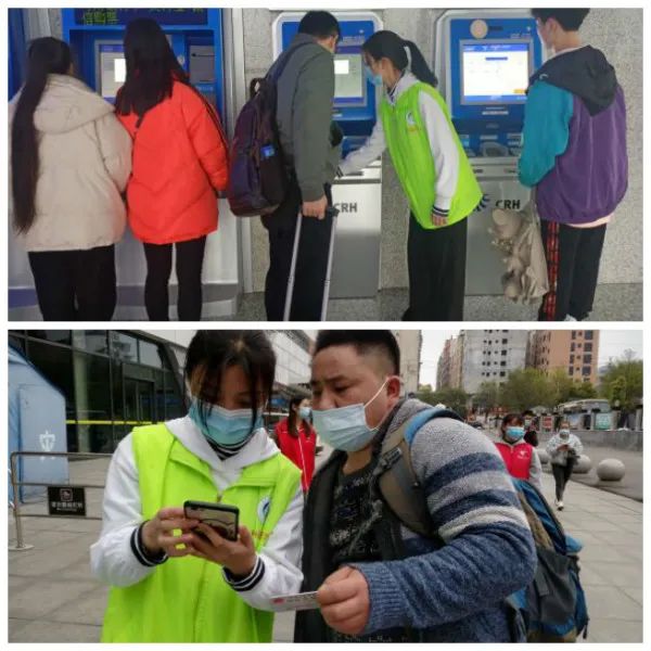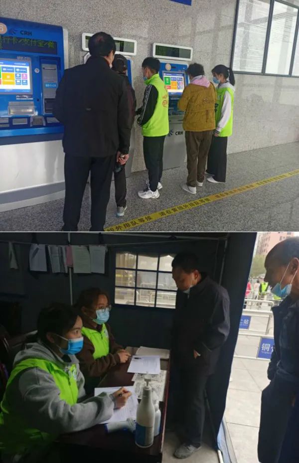 在进站口、登记处、售票大厅处均可看见志愿者们帮助旅客耐心解答各种问题,教不会扫码的旅客如何扫码,提醒旅客须戴好口罩并手持健康码进入站内,对于没有智能手机老年人,引导他们前往志愿者服务站登记方可入站。见到不会购票、取票的旅客,他们也会积极热情的上前询问是否需要帮助,帮助他们快速解决问题,为后来的旅客节约时间。