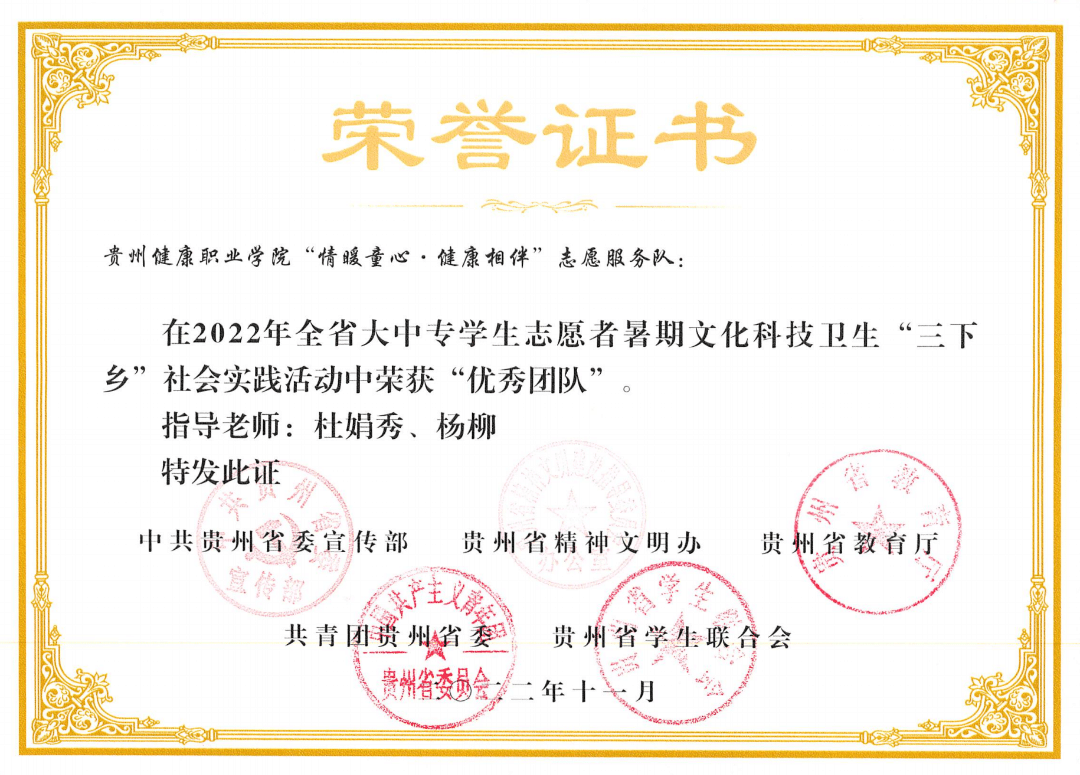 健康管理系将志愿服务作为党建带团建的重要抓手,培养学生感恩意识和奉献精神。积极组织发动广大青年大学生通过暑假期“三下乡”社会实践发挥专业优势服务社会。来自黄大发的寄语。2022年暑假,健康管理系团总支到遵义市播州区与播州区青年志愿者协会开展交流学习,前往该区平正仡佬族乡团结村开展志愿服务活动,活动中志愿者细心地为“七一勋章”“全国劳动模范”“时代楷模”“全国道德模范”称号获得者黄大发及当地群众测量血压、做艾灸和健康科普宣传,深受群众欢迎。活动开展后,“黄爷爷”寄语今年会厚生黔行志愿服务队的同学们,充分肯定了健康管理系学子的志愿服务工作,同时得到微铜仁视频号和中共贵州省委组织部贵州党建云关注。受到团中央的表彰。2022年,健康管理系大学生暑期“三下乡”活动成果显著,多个优秀团队、优秀品牌项目,多名优秀指导教师和优秀学生志愿者获得省、市、院表彰表扬,“情暖童心•守望健康”志愿服务队荣获团中央授予的2022年全国大中专学生志愿者暑期文化科技卫生“三下乡”社会实践优秀团队荣誉称号。