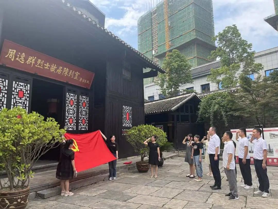 在周逸群烈士故居内,党员们怀着无比崇敬的心情,伴随讲解员声情并茂地讲解,一起瞻仰革命先辈当年生活和战斗时留下的珍贵遗物和历史图片,一幅幅图片、一件件实物、一幕幕场景感人肺腑、引人深思。随后,全体党员在周逸群烈士故居前重温入党誓词,铿锵有力的誓言在故居回响。