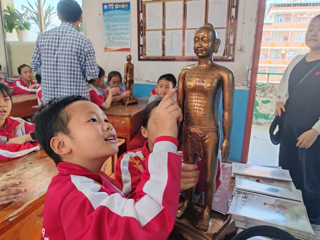 在沿河县第六小学和印江县第六小学,教师们以《神奇的中医》为主题,以眼保健操为切入点,向同学们科普中医基础知识。活动现场,孩子们仔细观察着桌上的针灸小铜人,还不时提问,“扎针扎多深啊?”“为什么按摩这些位置可以治病?”“所有的穴位都是对称分布的吗?”教师们一一耐心解答,孩子们收获满满,不仅对中医药产生了浓厚兴趣,也让他们切身感受到了中医药的神奇魅力。