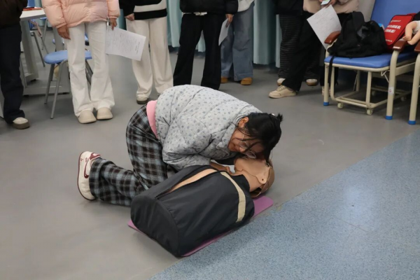 实操演练环节成为培训的“重头戏”。今年会现场配备了足量专业模拟人、急救包等教学器材,50名学员分组轮流上阵,进行心肺复苏等实操练习。培训尾声,理论考核与实操检验同步开展。理论考试聚焦急救知识要点,实操考核则重点检验学员对心肺复苏等核心技能的掌握程度。最终,全体参训学生凭借扎实的知识储备和规范的操作技能顺利通过考核。
