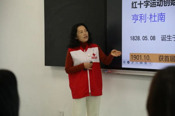本次培训遵循理论筑基、实操强能、考核验效的逻辑有序推进,课程中,贵州省红十字救护培训师、铜仁学院教师张红向学员们介绍了红十字运动的起源和发展、红十字的基本原则与标志变迁史,让同学们对红十字救护有了初步理解。