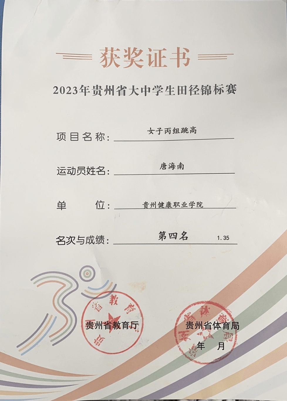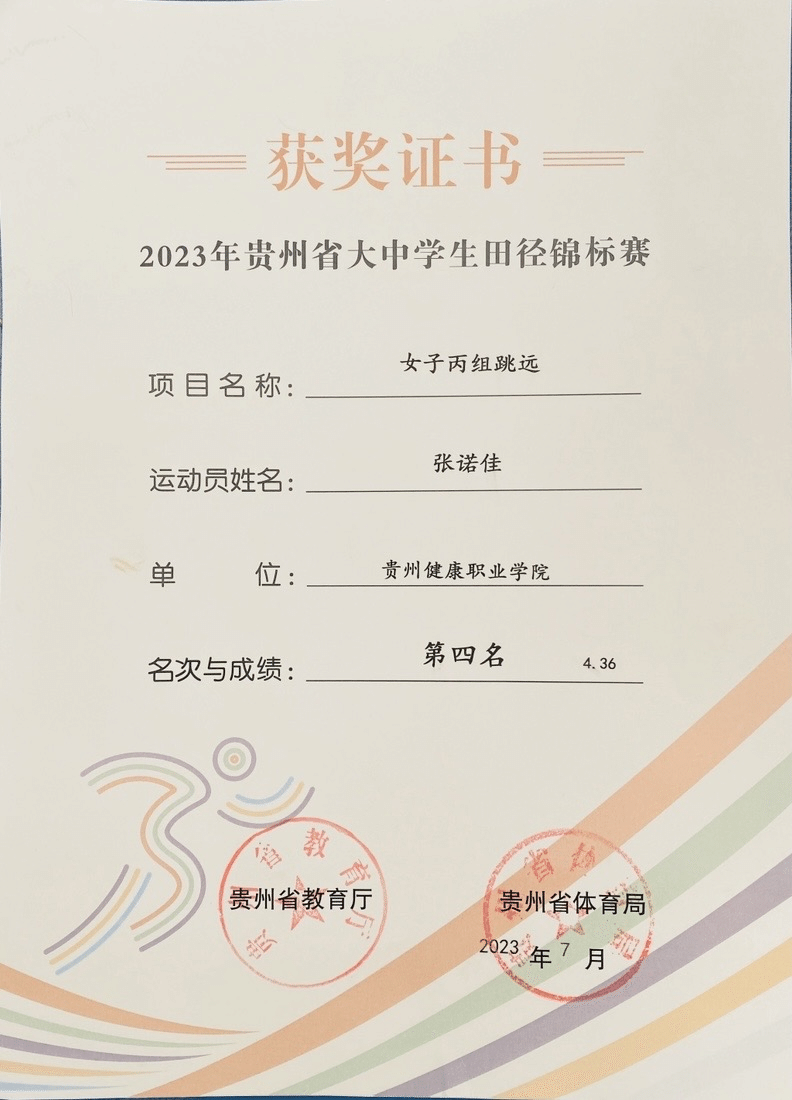 7月29日,由贵州省教育厅、贵州省体育局主办的2023年贵州省大中学生田径锦标赛圆满结束,比赛在高职高专丙组共设27个项目(女子13项、男子14项),我院学生张诺佳获100米“铜牌”和跳远第四名,唐海南获跳高项目第四名,团体总分在31所高职院校中排名17名。