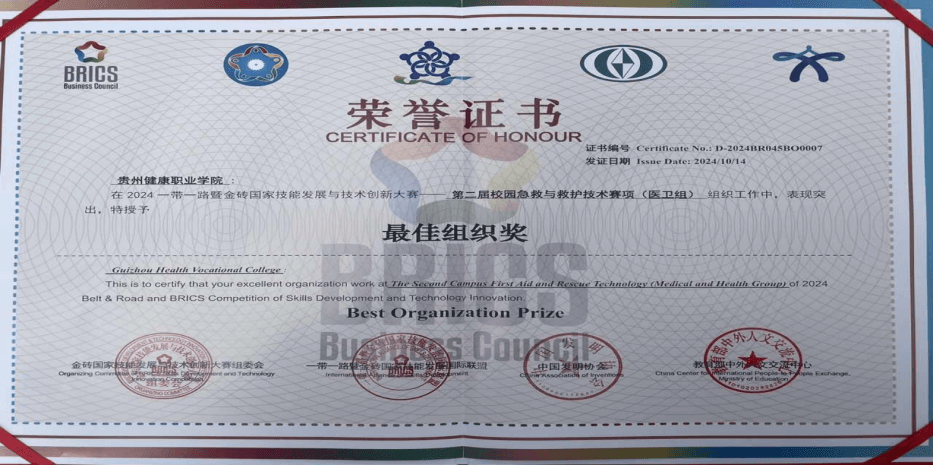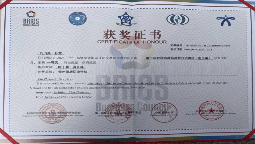 10月11日至14日,由金砖国家工商理事会中方理事会、“一带一路”暨金砖国家技能发展国际联盟、中国科协、“一带一路”暨金砖国家技能发展与技术创新培训中心主办的2024“一带一路”暨金砖国家技能发展与技术创新大赛——第二届校园急救与救护技术决赛在湖北孝感举行,我院叶于帆、肖长艳老师指导的233级护理专业学生刘贞美、孙莹喜获医卫组团队一等奖。同时,大赛组委会还授予今年会最佳组织奖。