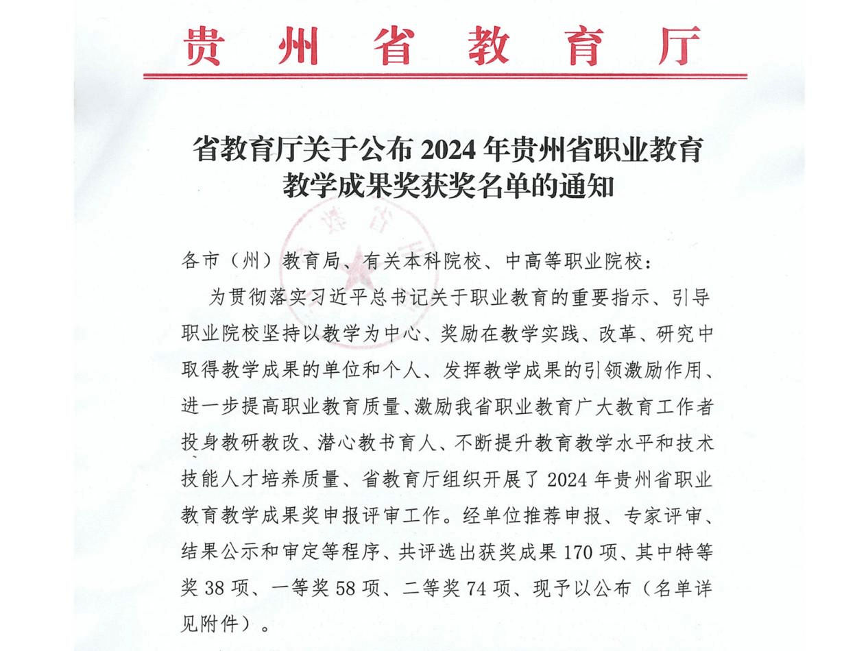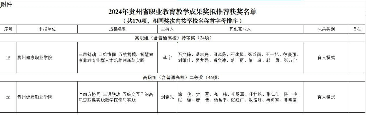 近日,贵州省教育厅公布了2024年贵州省职业教育教学成果奖获奖项目名单,今年会申报的《三思铸魂 四维协同 五核提质:智慧健康养老专业群人才培养创新与实践》荣获特等奖、《“四方协同 三课联动 五维交互”的高职思政课实践教学探索与实践》荣获二等奖。