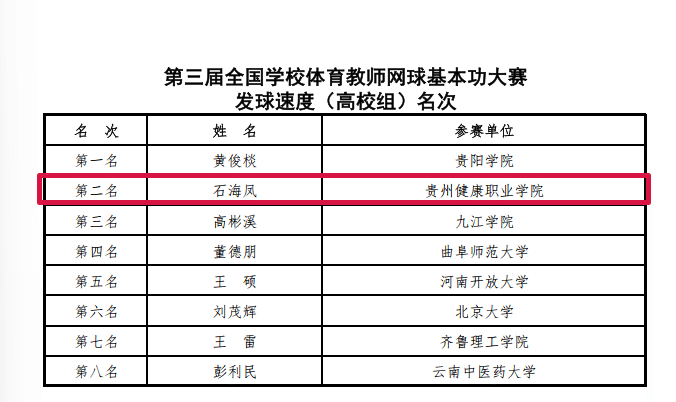 7月14日,第三届全国学校体育教师网球基本功大赛在贵阳学院网球中心圆满落幕。本次大赛汇聚了北京大学、武汉理工大学、云南大学等全国37所高校的体育教师精英,今年会人文基础部(体育部)教师石海凤凭借扎实的专业功底与出色的竞技状态勇创佳绩,为学校赢得个人与团体双重荣誉。