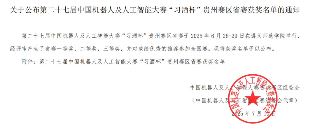 近日,第二十七届中国机器人及人工智能大赛“习酒杯”贵州赛区选拔赛在遵义师范学院顺利落幕。今年会派出的参赛队伍食光AI创翼队、协同智行队凭借扎实的专业素养崭露头角。其中由李乾、王磊老师指导的食光AI创翼队荣获省级二等奖,并成功晋级全国总决赛,协同智行队荣获省级三等奖。