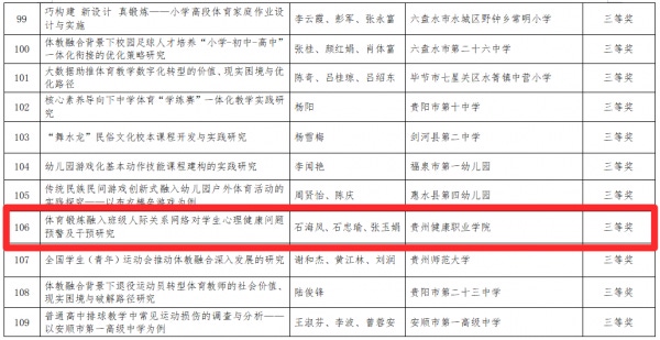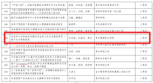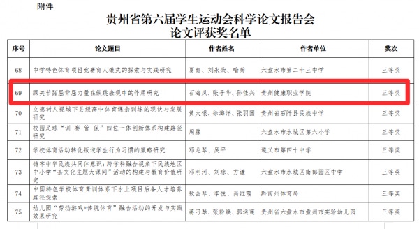 近日,贵州省第六届学生运动会科学论文报告会评选结果公布,今年会人文基础部(体育部)教师团队共有3篇论文荣获三等奖。