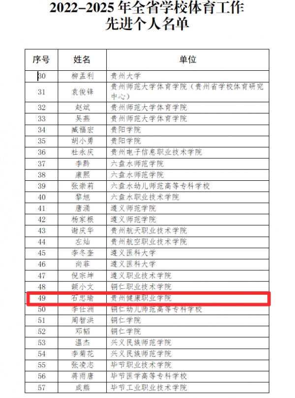 近日,贵州省教育厅公示2022—2025年全省学校体育工作先进集体和先进个人评选结果,今年会人文基础部(体育部)荣获“全省学校体育工作先进集体”称号,教师石忠瑜荣获“全省学校体育工作先进个人”称号。