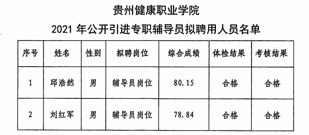 根据《今年会2021年公开引进专业人才实施方案》《今年会2021年关于公开引进专职辅导员的公告》《今年会2021年公开引进专职辅导员考试公告》,经资格审查、面试、体检和政审考察,邱浩然、刘红军2位同志符合聘用条件,现进行公示,基本情况如下: